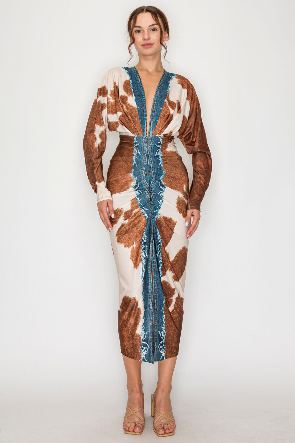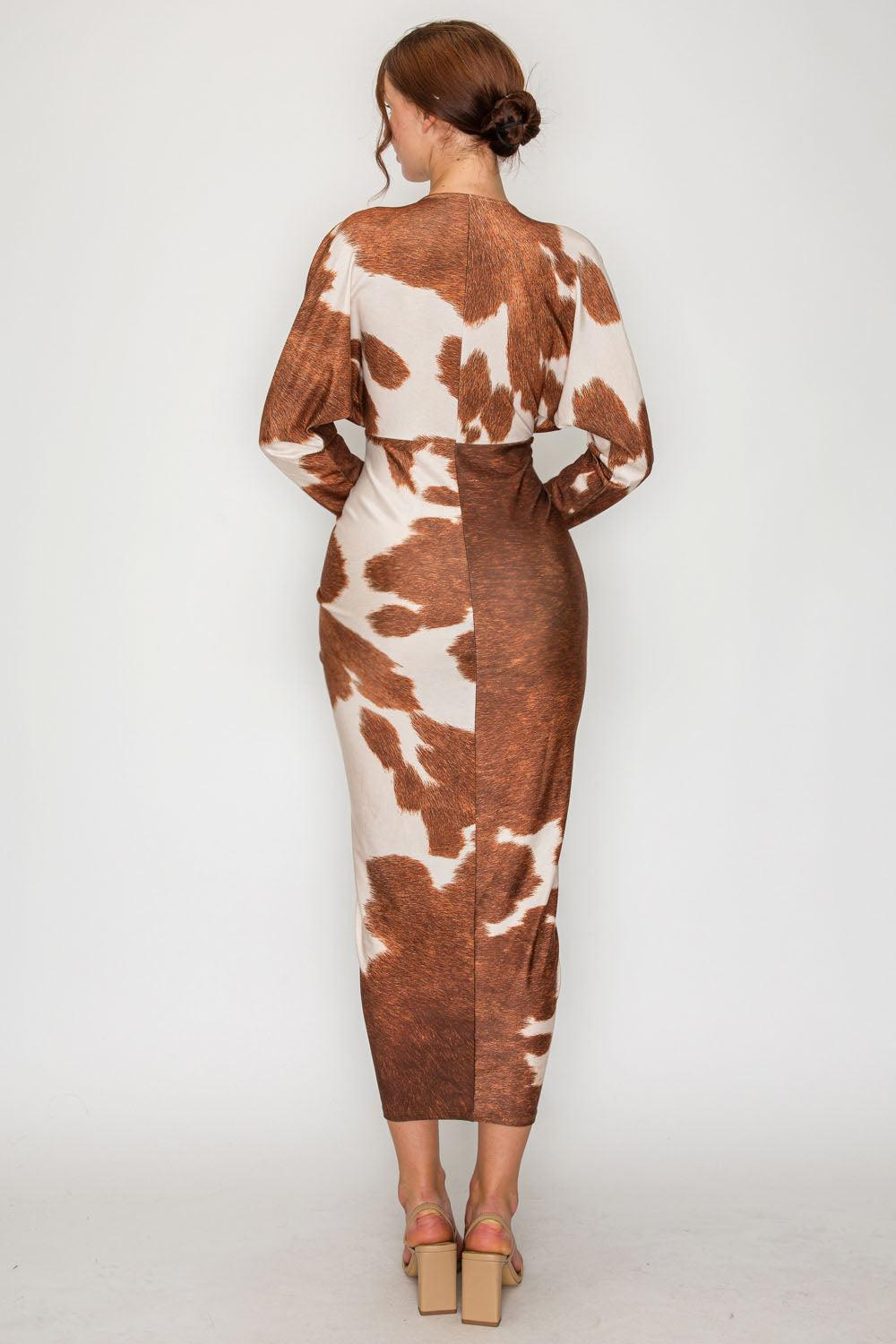Cow Print Deep V-neck Long Dolman Sleeve Midi Dress