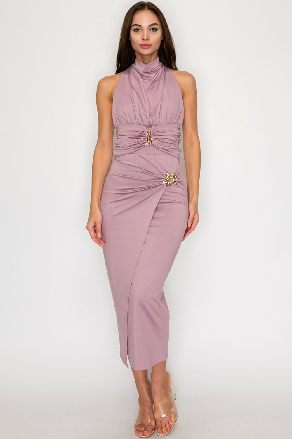 • Front wrap-style ruched detail with metal ornament
